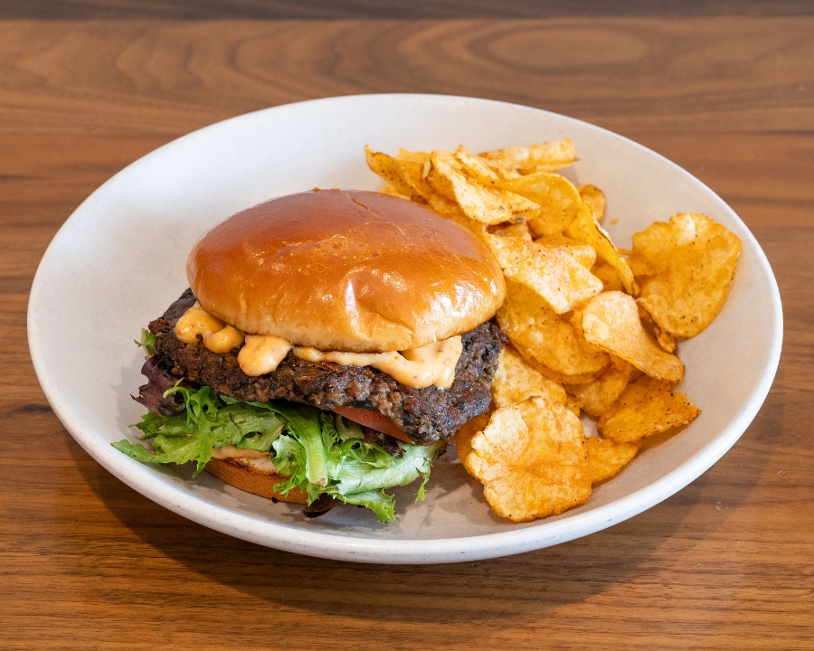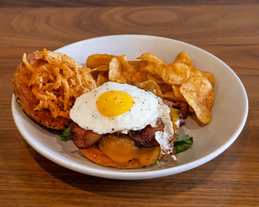Bison patty, burger sauce, caramelized onion, mushrooms, arugula, cheddar, bacon, fried egg, crispy onions, sesame bun