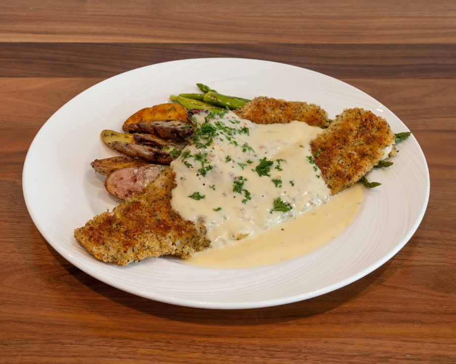 Pistachio-crusted walleye filet, roasted fingerling potatoes, asparagus, lemon beurre blanc, parsley