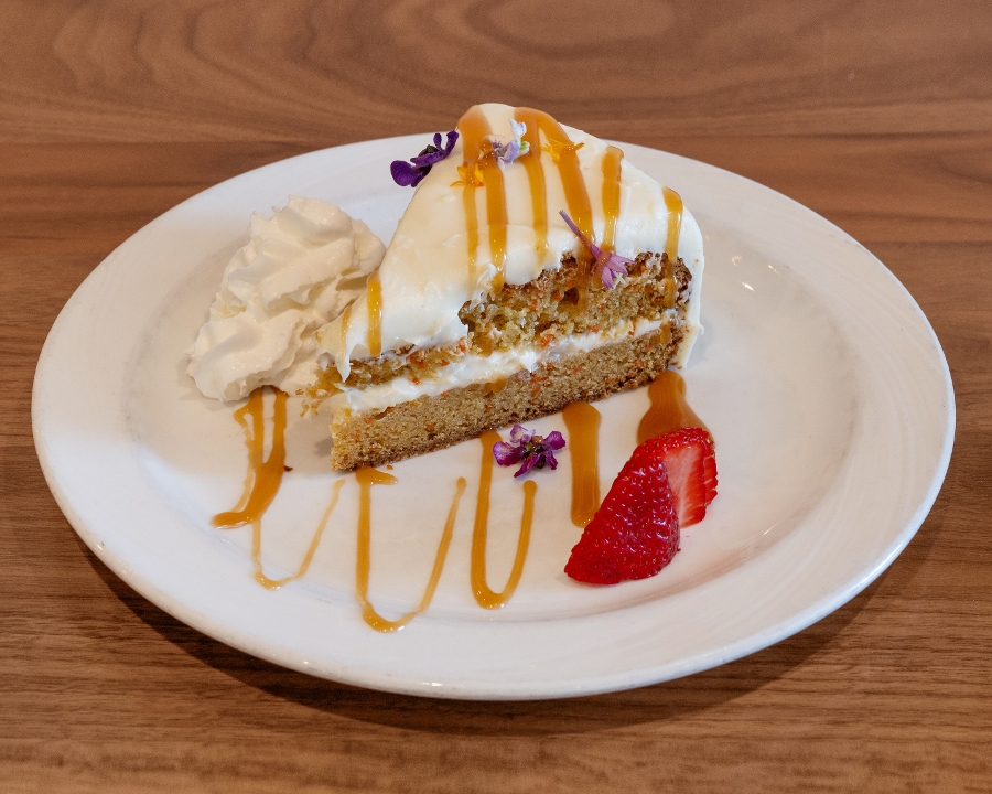 House-made carrot cake, cream cheese frosting, caramel, strawberry