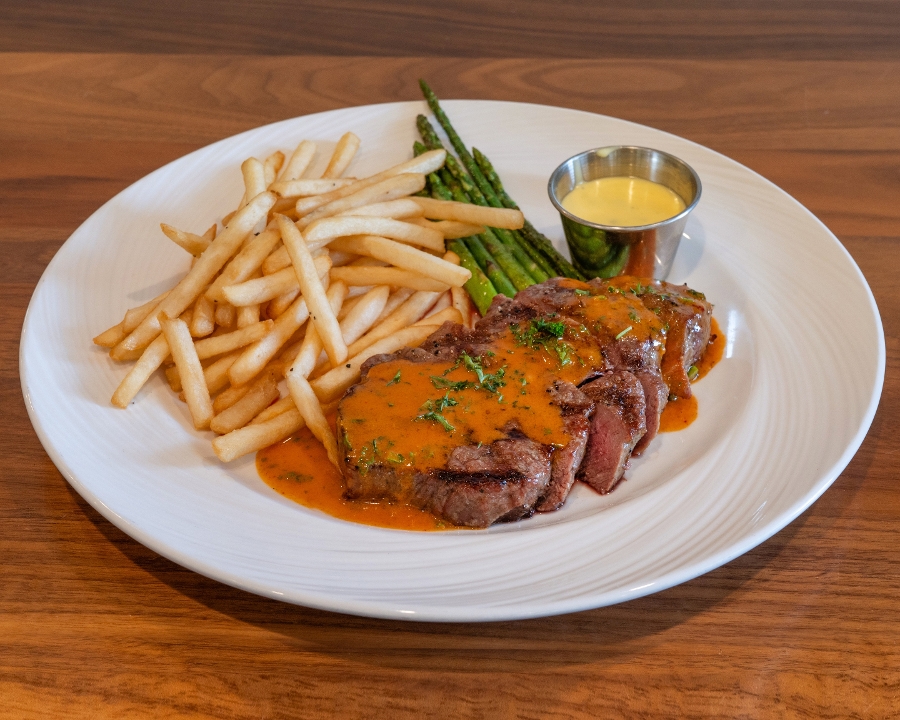 8oz hand-cut New York strip, shoestring fries, asparagus, bearnaise, cowboy butter