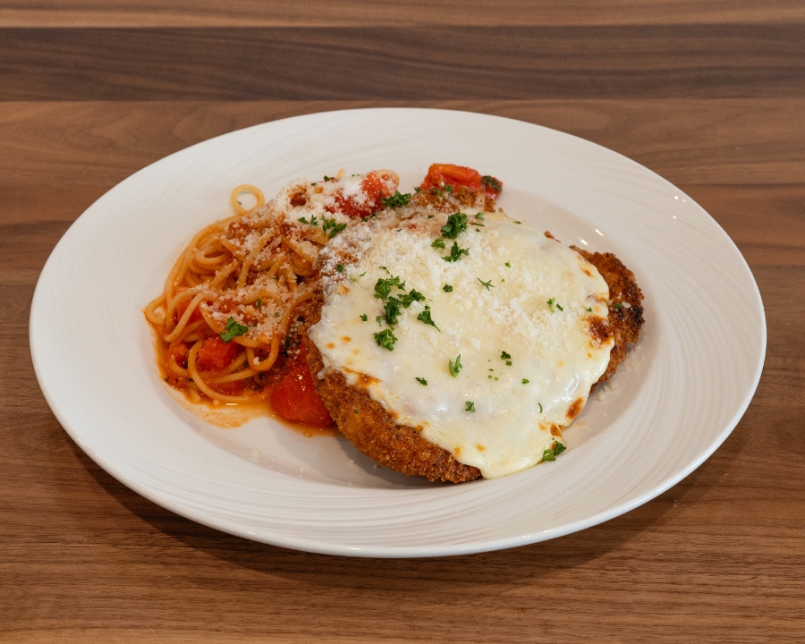 Hand breaded chicken breast, house made marinara, spaghetti, parmesan, roma tomato, basil, mozzarella cheese.