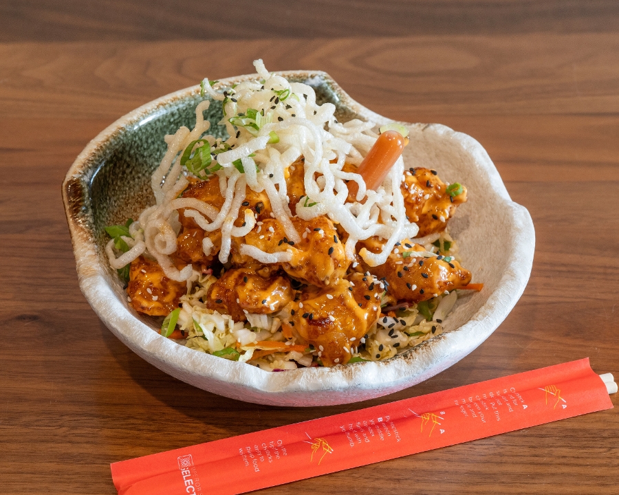 Tempura battered shrimp, Asian slaw mix, lemon oil, Sriracha aioli, fried rice noodles, Cry Baby Craig’s pipette