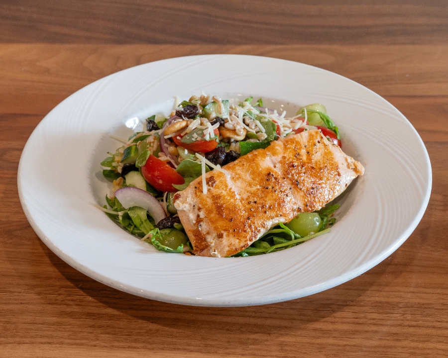 Grilled salmon, grapes, cucumber, red onion, cherry tomatoes, dried cherries, cashews, honey lime vinaigrette, shredded parmesan, pomegranate seeds