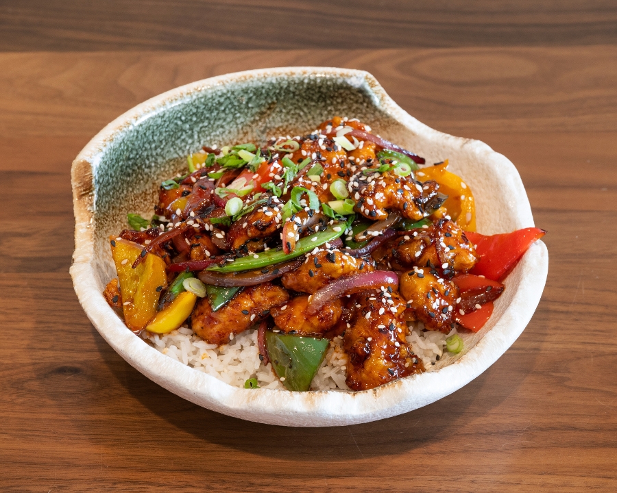 Hand-battered boneless chicken, broccoli, bell pepper, onion, snow peas, sesame ginger sauce, sesame seed, green onion, coconut rice